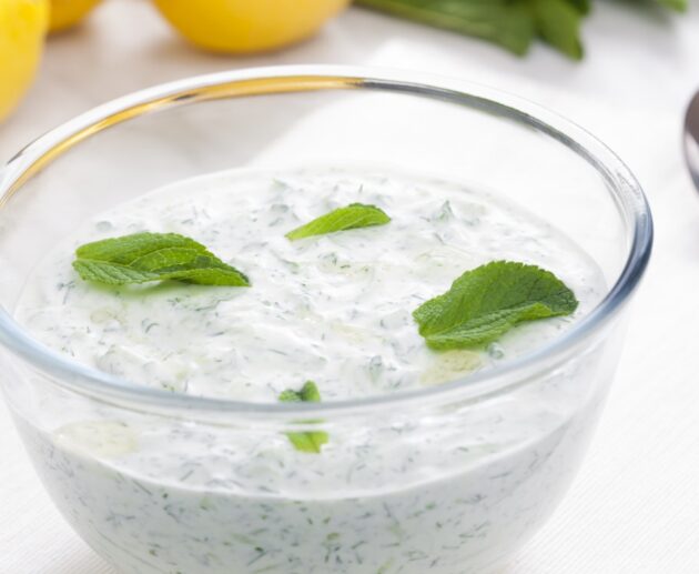 يُعد طبق الزبادي بالخيار والشبت/النعناع خيارًا منعشًا وخفيفًا يُقدم كمقبلات أو طبق جانبي يُكمل العديد من الأطباق الرئيسية. يتميز بمذاقه البارد والحامض قليلاً، وقوامه الكريمي،
