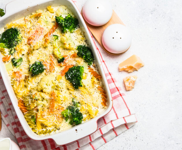 معكرونة بالفرن بالبروكلي والقرنبيط وصلصة الجبن