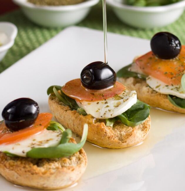 يُعد كروستيني الطماطم، جبنة الموزاريلا، والزيتون مقبلًا إيطاليًا بسيطًا وأنيقًا يتميز بمذاقه المنعش والألوان الجذابة. يتكون هذا الطبق من شرائح
