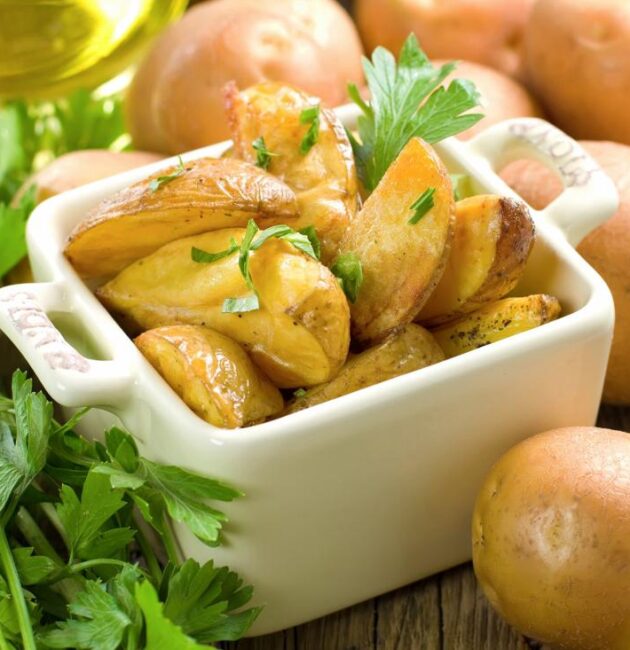 البطاطس المشوية تُعد بديلًا صحيًا للبطاطس المقلية، حيث تحتفظ بطعمها الغني دون دهون زائدة. تُحضَّر بقشرها للحصول على الألياف، ويمكن
