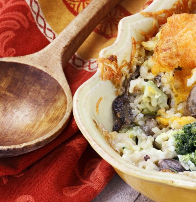 طاجن البروكلي بالجبن طبق دافئ ودسم يجمع بين البروكلي الطازج، الفطر ، الأرز المطهو، وصوص الجبن الشيدر الغني. مثالي كوجبة