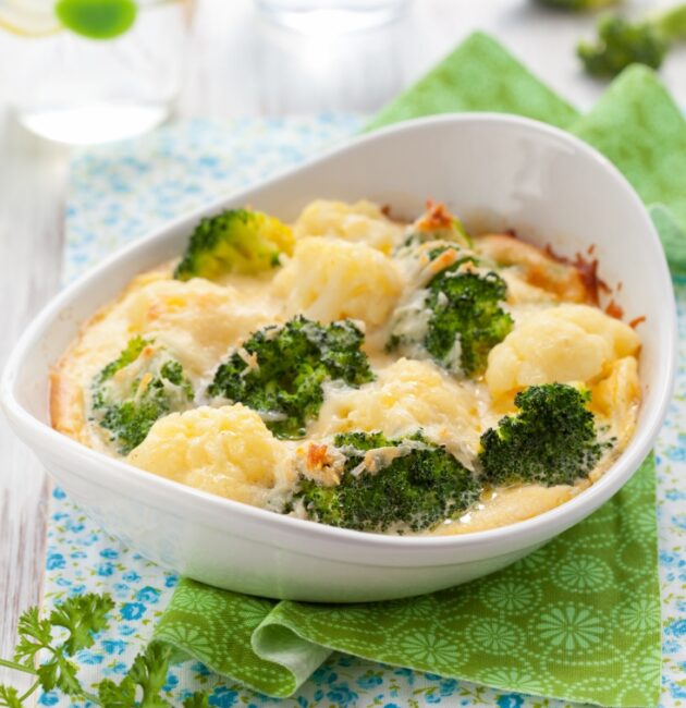 يُعد جراتان البروكلي والقرنبيط بالجبنة طبقًا شهيًا ومغذيًا يجمع بين النكهة الخفيفة للخضروات وقوامها الطري مع غنى الجبن الذائب وسطحه