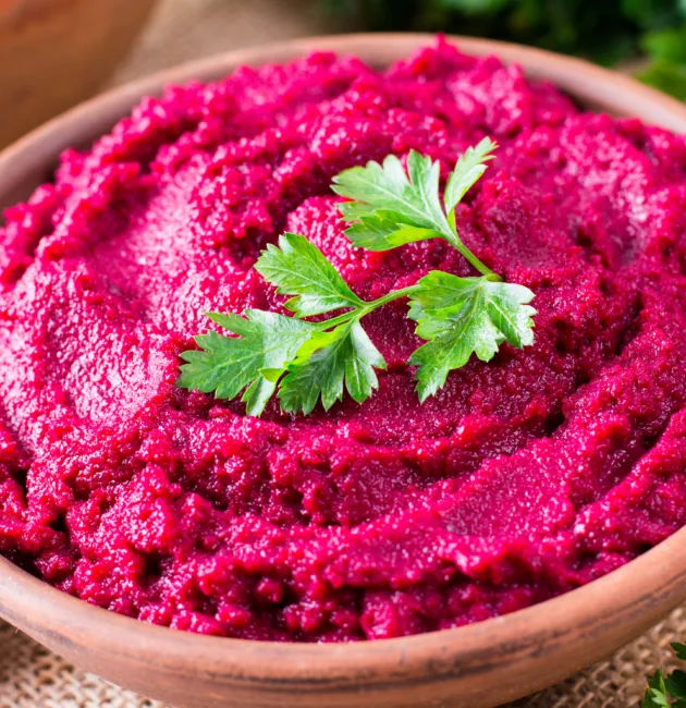 تُعتبر سلطة مهروس الحمص بالشمندر (البنجر) مزيجًا لذيذًا بين الحمص الكلاسيكي ونكهة الشمندر (البنجر) الترابية الطبيعية. لونه الزاهي وطعمه الغني