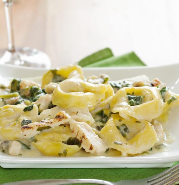 تورتيليني بجبن الأسياغو والدجاج المشوي