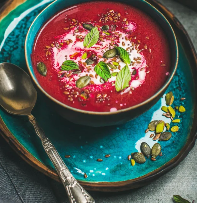 يُحضَّر حساء البنجر كمصدر غني بمضادات الأكسدة والحديد، ويُعزَّز بالنكهة الطازجة للنعناع وبالقيم الغذائية العالية لبذور الشيا، الكتان، والقرع. يُقدَّم