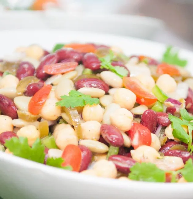 تُحضَّر هذه السلطة النباتية المغذية باستخدام الفاصوليا الحمراء، الفاصوليا البيضاء، والحمص، وتُتبَّل بتوابل بسيطة ومنعشة تجعلها خيارًا مثاليًا للغداء الخفيف