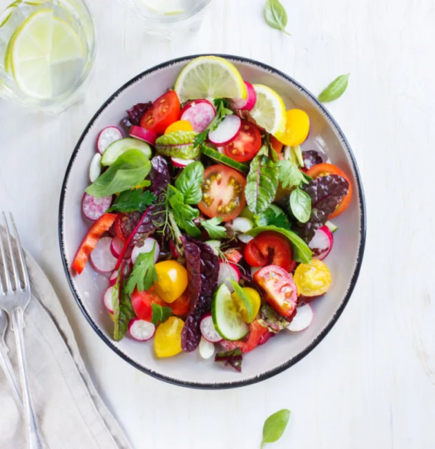 تُحضَّر هذه السلطة الطازجة باستخدام مجموعة متنوعة من الخضروات الملونة المليئة بالفيتامينات والمعادن، وتُعد خيارًا مثاليًا لمن يتبع نظامًا غذائيًا