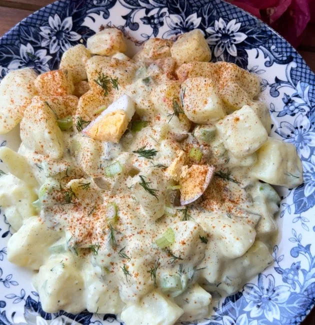سلطة البطاطس من الأطباق الجانبية الغنية والمغذية، وتتميز بمذاقها الكريمي اللذيذ الناتج عن مزيج المايونيز والزبادي والمستردة، مع لمسة منعشة