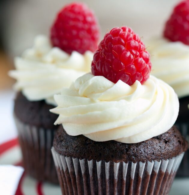 تُعد كب كيك الشوكولاتة مع كريمة الزبدة وتوت العليق تحفة فنية تجمع بين غنى الشوكولاتة الداكنة وقوامها الرطب مع نعومة