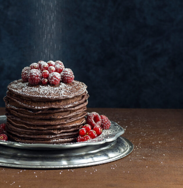 تُعد فطائر البان كيك بالشوكولاتة مع التوت الأحمر طبق إفطار فاخر وشهي، أو تحلية غنية وممتعة. يتميز هذا الطبق بالجمع