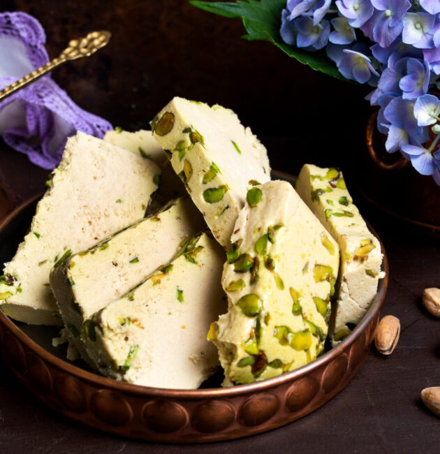 تُعد الحلاوة الطحينية بالفستق حلوى غنية وذات قيمة غذائية عالية، تتميز بقوامها المتفتت والذائب في الفم، ونكهتها المميزة من السمسم